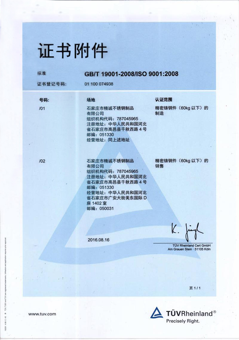 石家莊市精誠不銹鋼制品有限公司,是一家從事專業(yè)精密鑄造的企業(yè)。主要生產(chǎn)不銹鋼、合金鋼、低碳鋼及各種特種合金材質(zhì)的精密鑄件及加工產(chǎn)品。